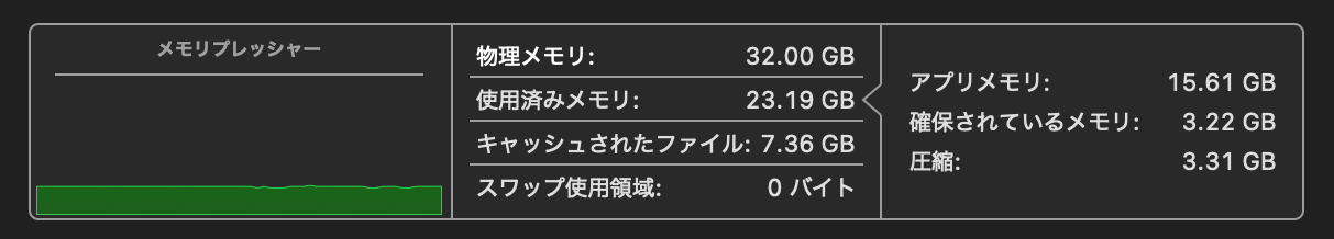 RAM使用量は23.19GB、スワップは0バイト、メモリプレッシャーは緑のまま。