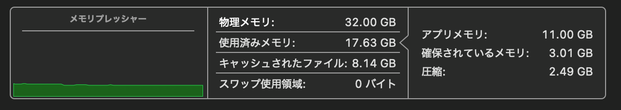 スワップがゼロというのが個人的には一番大事なポイントで、スワップが発生するとアプリの切り替えがワンテンポ遅くなるんですよね。それがない状態で2GBのファイルを扱えているのは、仕事中のストレスのなさに直結します。