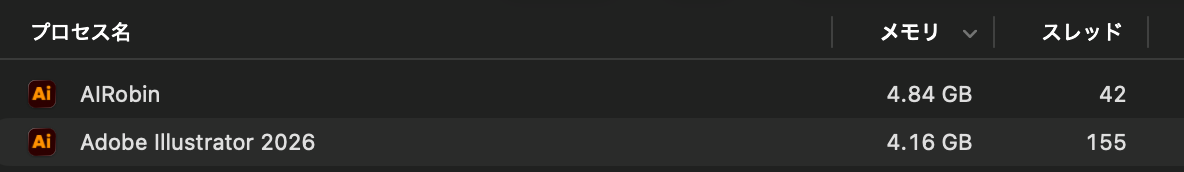 AIRobinがメモリを食ってるのは想定外でした 笑 プラグイン込みでこの数字なので、素のIllustratorだともう少し余裕があるはずです。