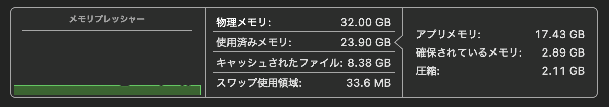 使用済みメモリは23.90GB。それでもスワップはわずか33.6MB、メモリプレッシャーは緑のまま。32GBあるからこそ、これだけ詰め込んでも余裕で動いてくれてます。
