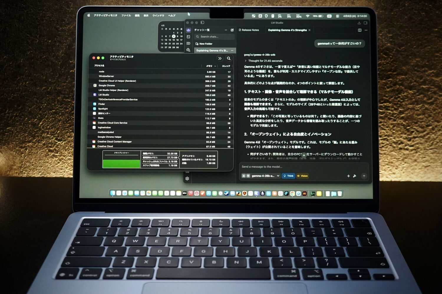 確信したのは、ある作業中のことです。Chromeのタブを20枚くらい開いたまま、Illustratorで実寸のデータを触って、さらにClaudeのデスクトップアプリも立ち上げてた。前のMacBookならここで「ちょっと待って」って感じの重さが来るはずなのに、M5はなにもなかった。静かに、普通に動いてた。