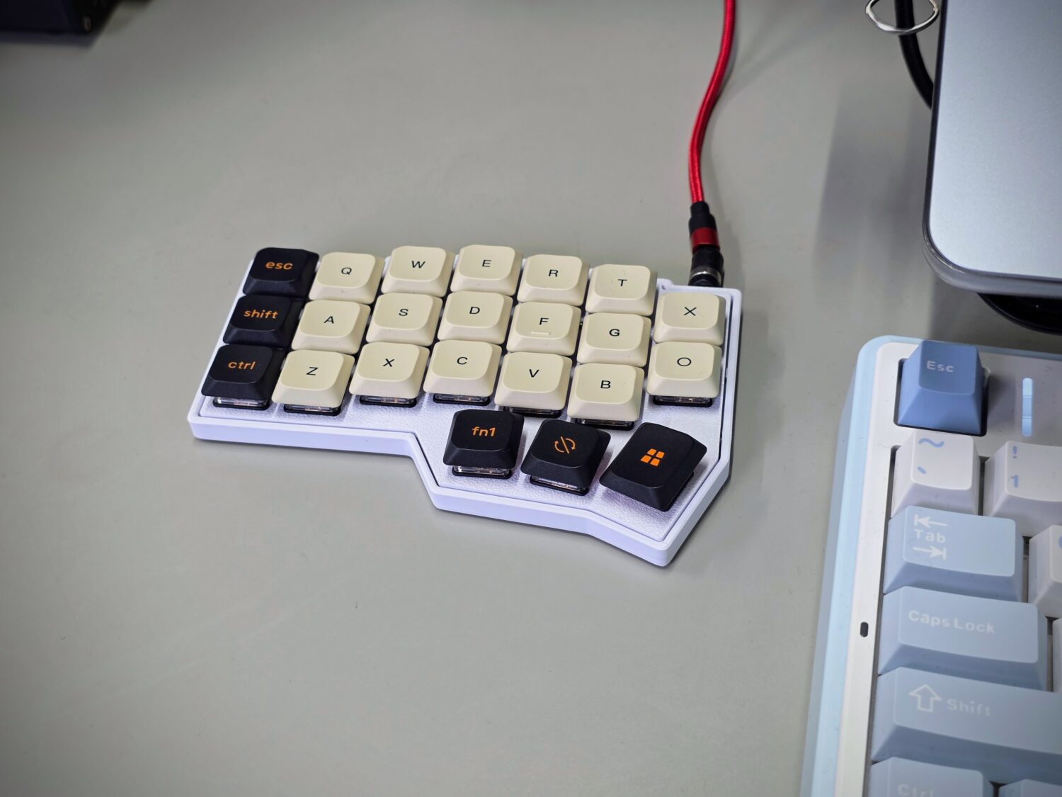 選択肢が一気に広がったところで行き着いたのがWomierのロープロファイルキーキャップ。クリーム×ブラックの2トーンで、親指キーにオレンジのアクセント。グラフィックデザイナーとしてこの配色は刺さりました 笑